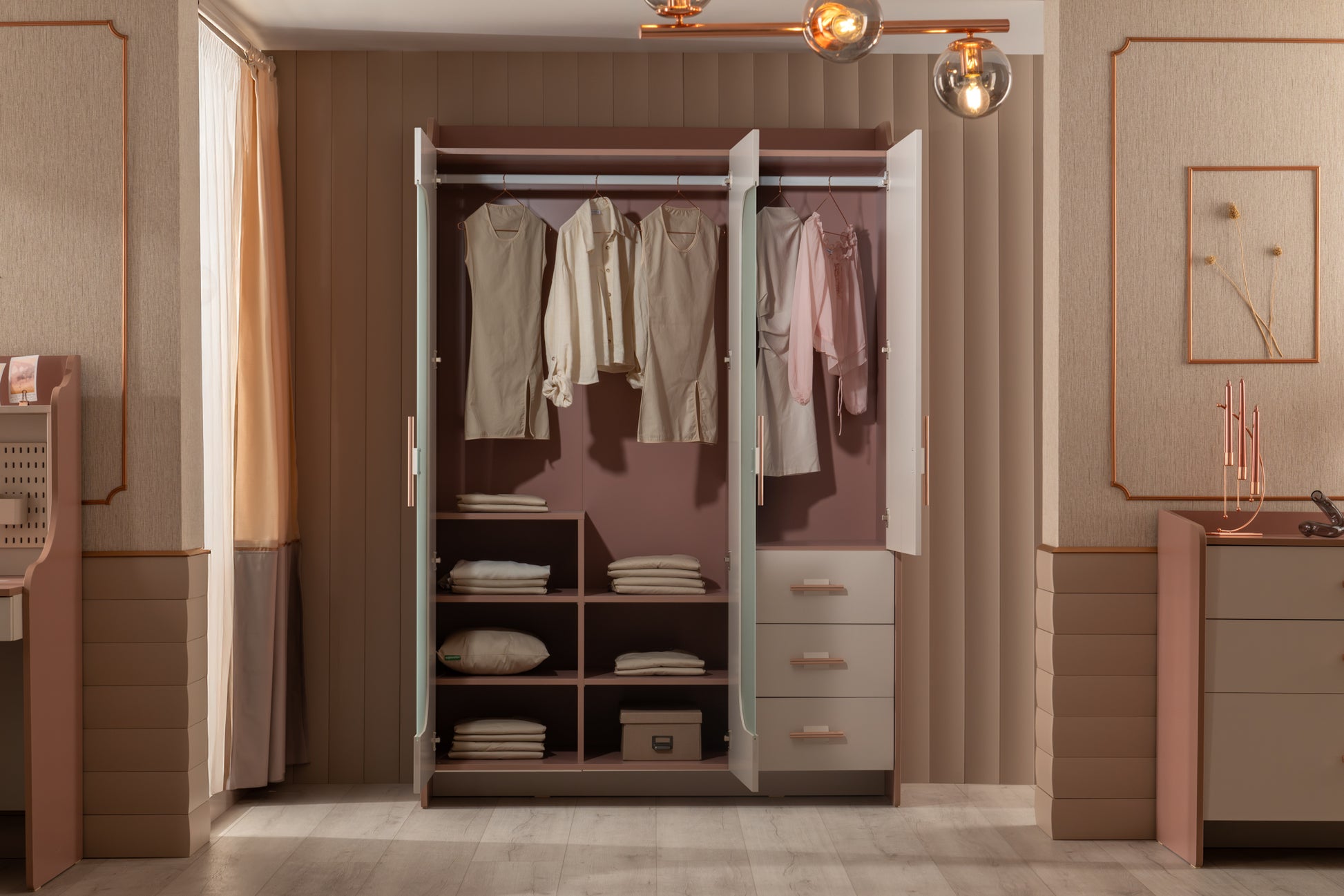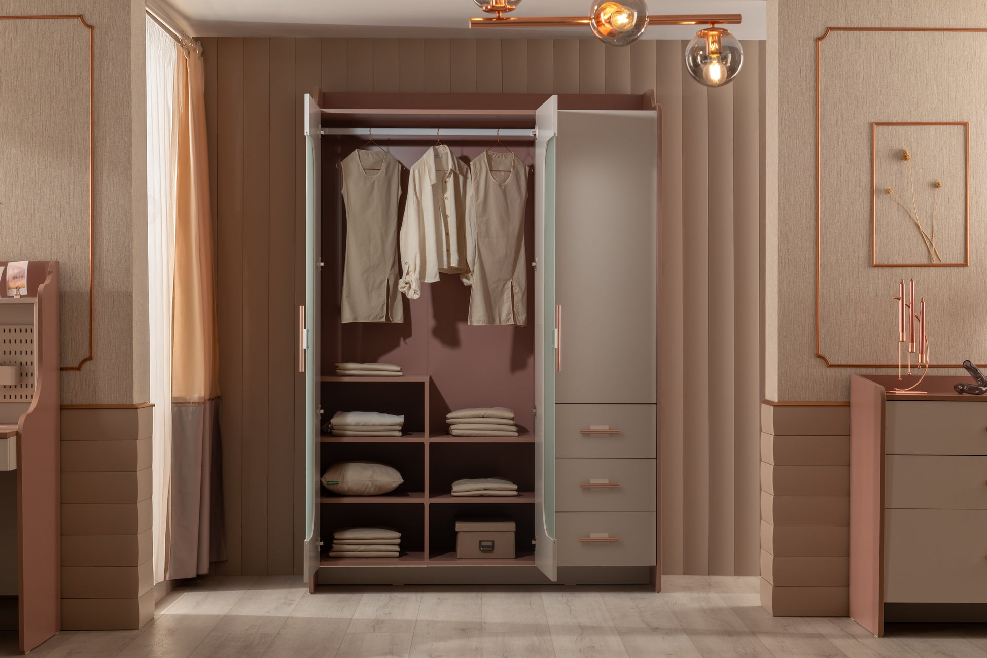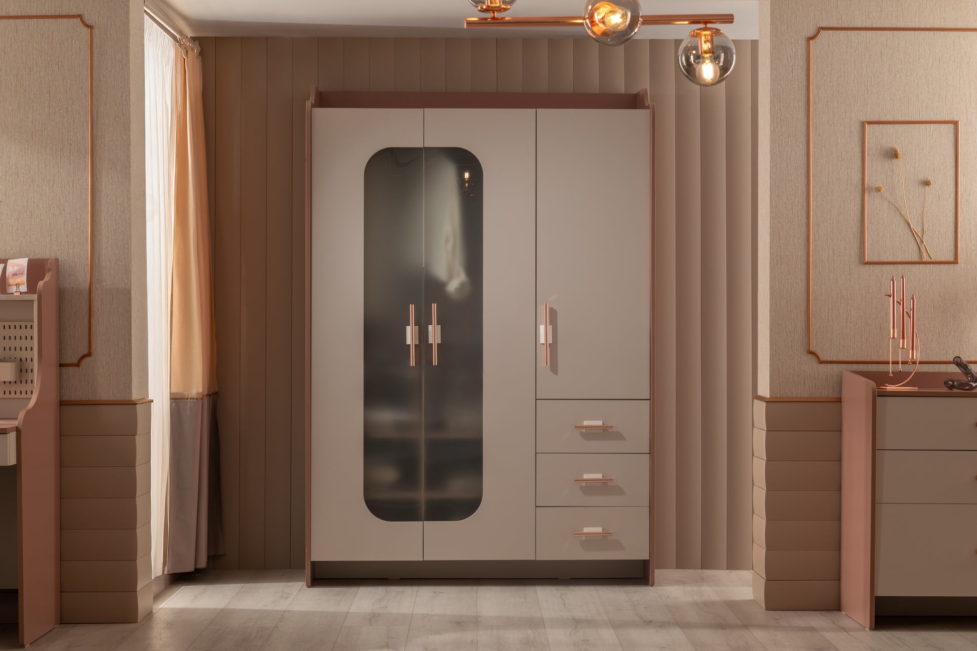 Estella 3T Kleiderschrank vereint Eleganz und Stil in einem einzigartigen Design und verleiht dem Raum mit gläsernen Türen und glänzenden Griffen eine exklusive Note – zeitlos attraktiv für Jugendliche und Erwachsene.