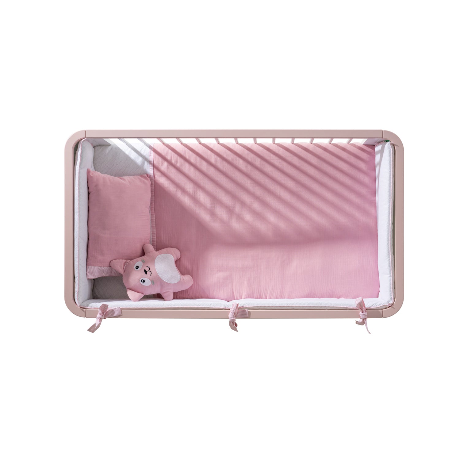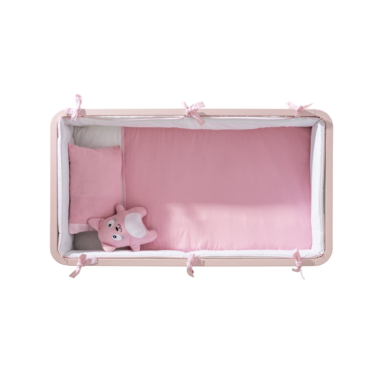 Kuschelkissen: aus puderrosafarbenem Musselin, mit Applikationsnähten und Stickerei