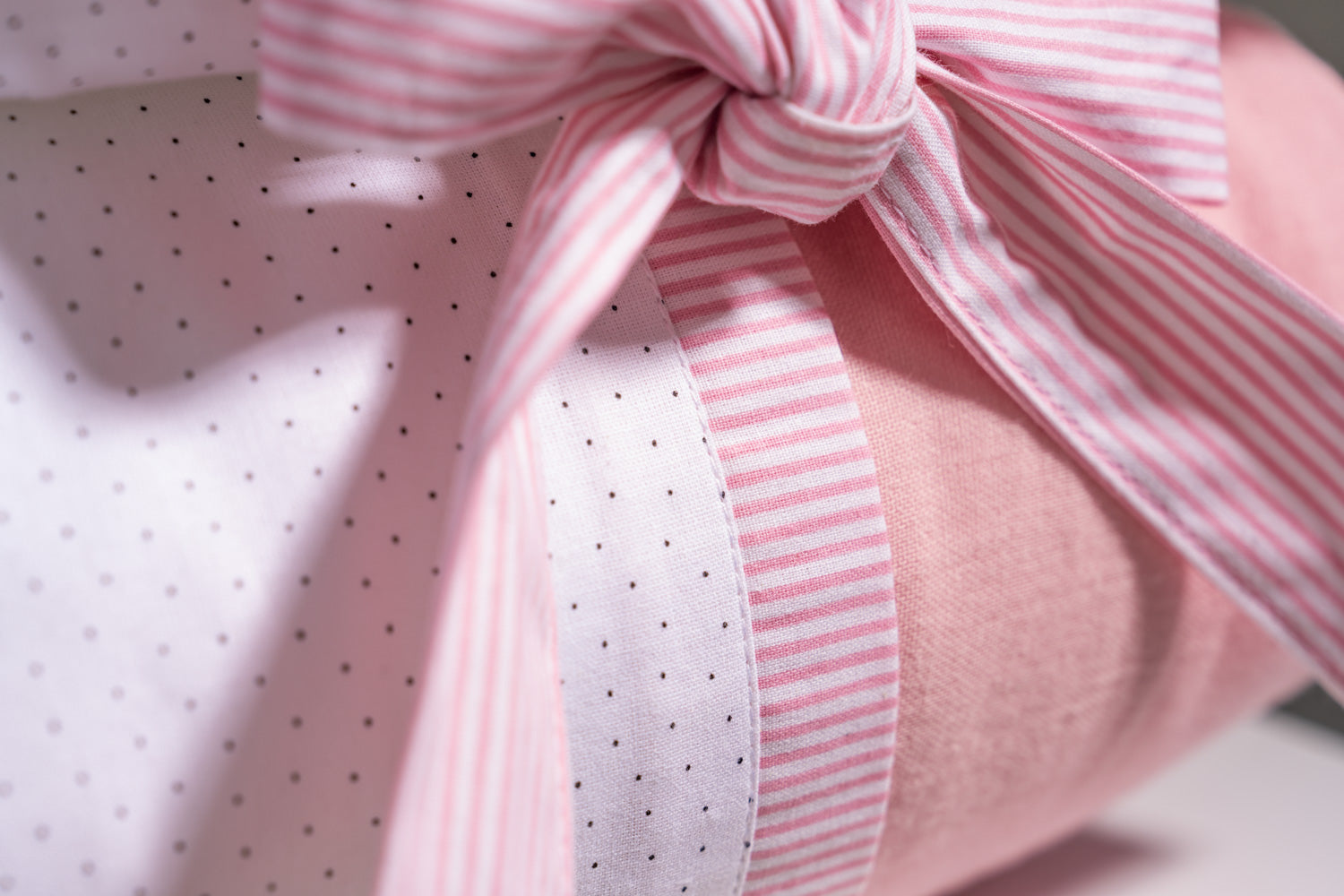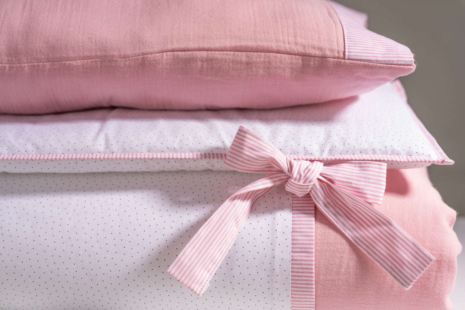Kopfteil des Bettbezugs: gepunkteter Stoff und puderfarbene Streifen