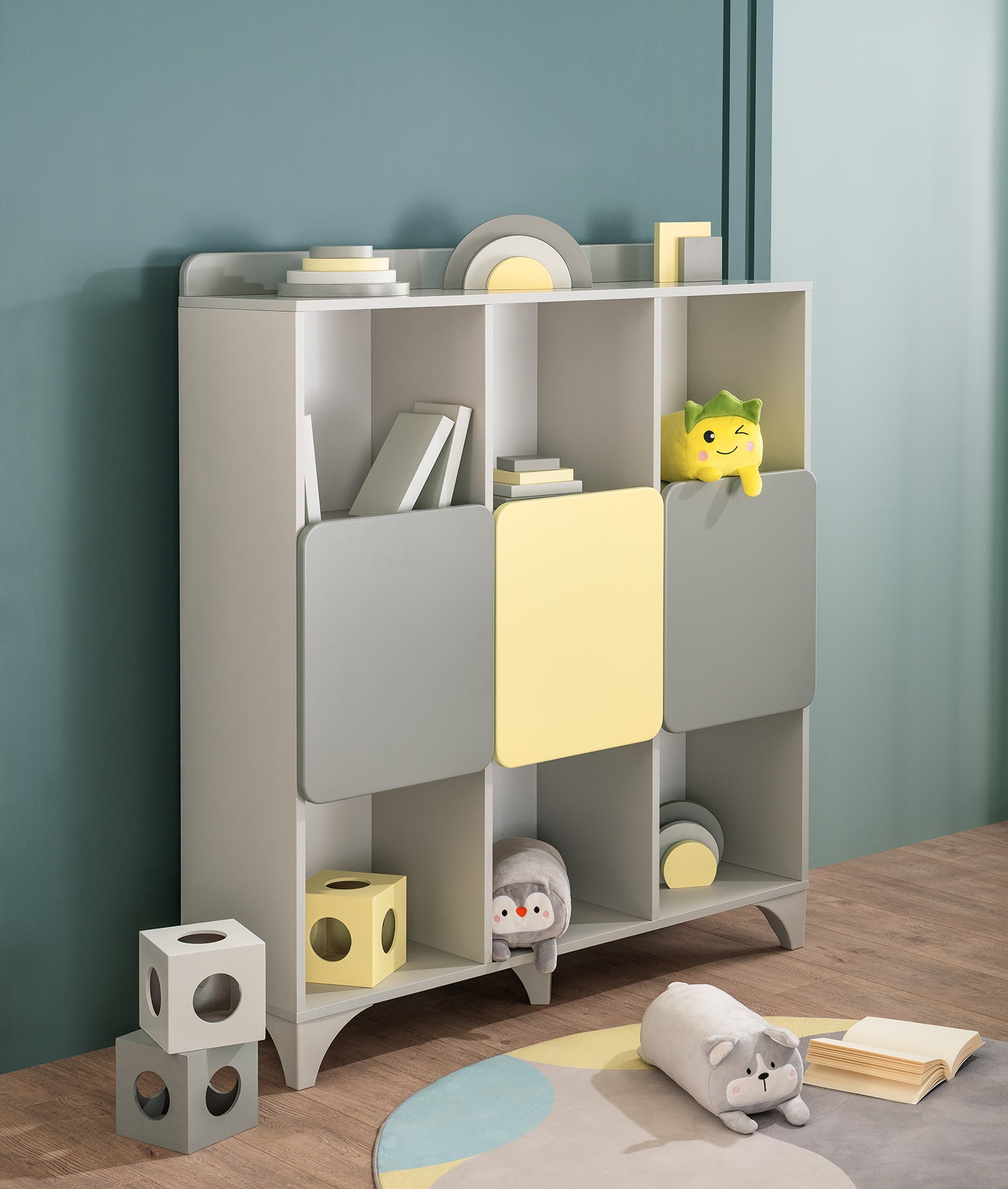 Der MINIA Spielzeugschrank ist mit Fächern ausgestattet, die für Spielzeug und persönliche Gegenstände geeignet sind und Ihrem Kind den Alltag erleichtern. Die Schrankfächer mit Türen und die Regale ermöglichen es, von Spielzeug bis hin zu Büchern viele persönliche Schätze ordentlich zu verstauen.