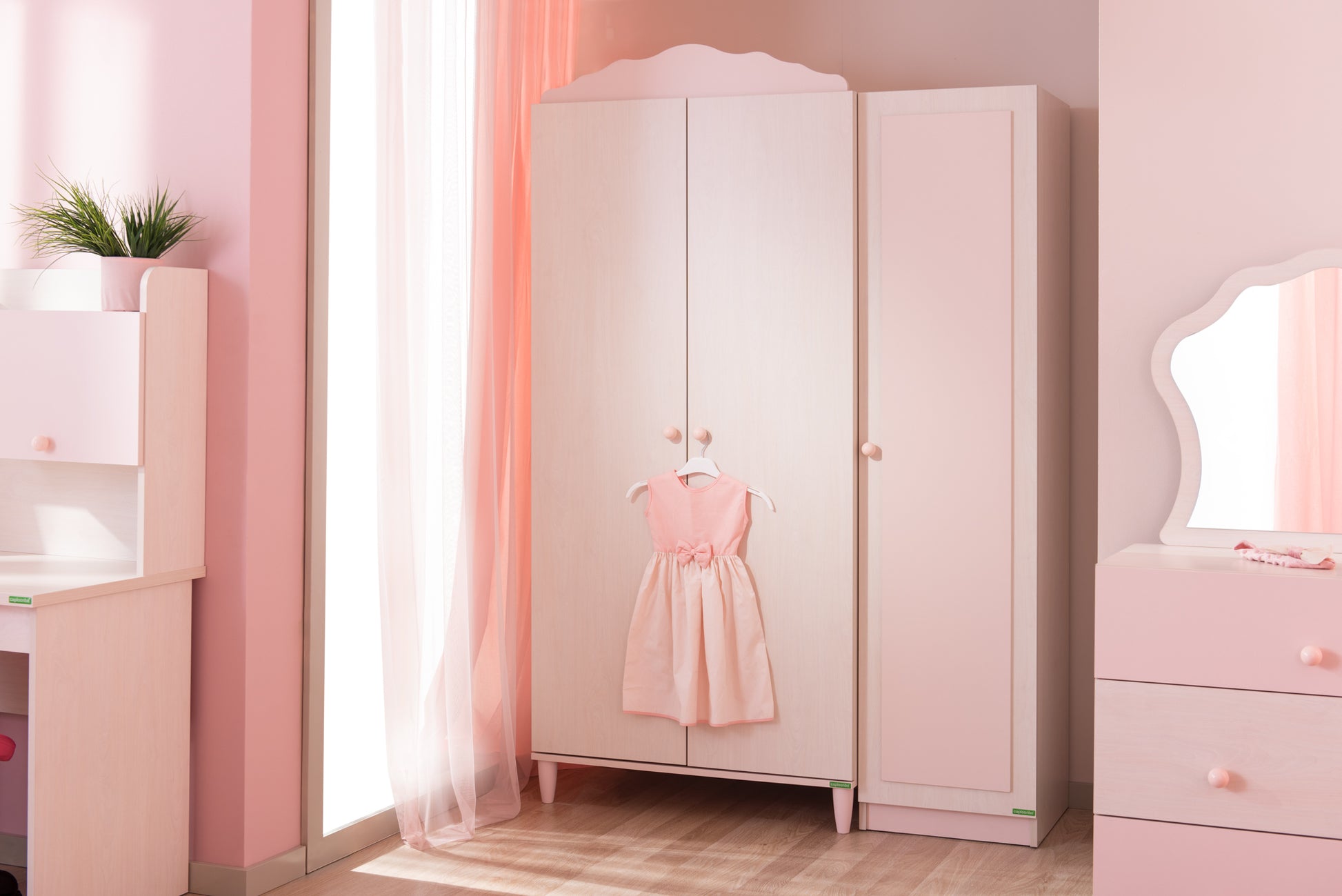 Der POLLINA 3T Schrank ist eine funktionale und ästhetische Aufbewahrungslösung, die mit eleganten Details die bezaubernde Atmosphäre des Kinderzimmers perfekt ergänzt. Die Helligkeit des Birkenholzes in Kombination mit dem harmonischen Rosaton verleiht dem Zimmer Ihrer kleinen Prinzessin einen Hauch von Eleganz und bietet zugleich großzügigen und durchdachten Stauraum, um Ordnung zu halten.